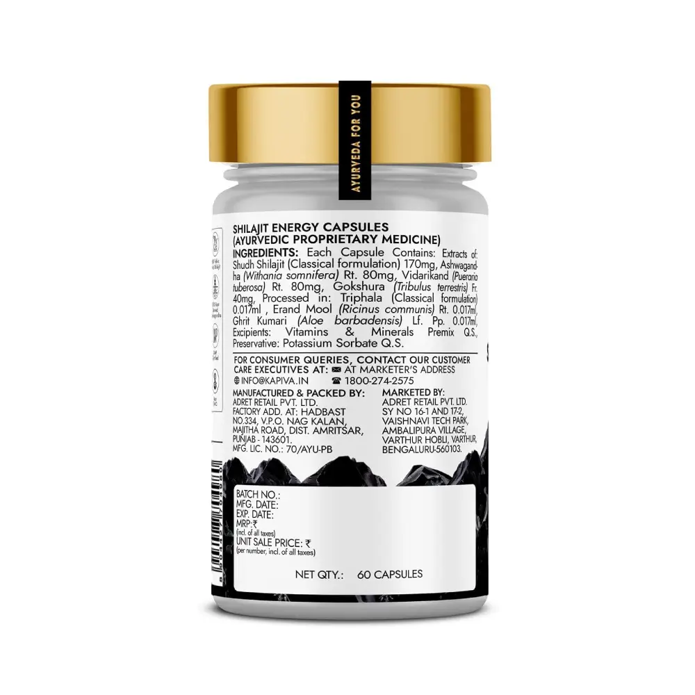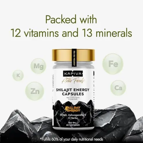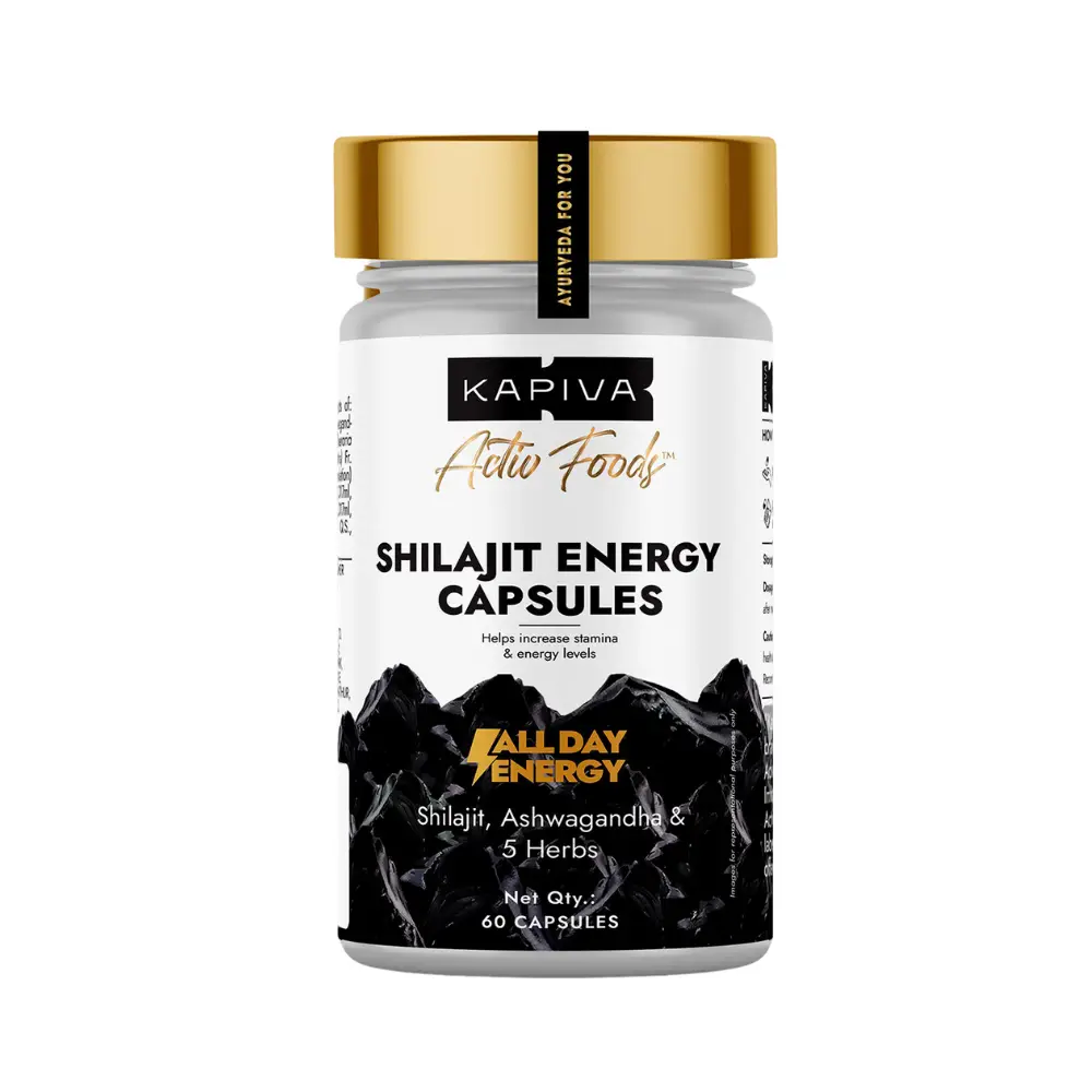 Choose Kapiva Shilajit Energy Capsules for a trusted, Ayurvedic way to boost your stamina, energy, and overall vitality. Made with 100% pure Himalayan Shilajit, enhanced by Ashwagandha, Gokshura, and Vidarikand, this formulation is clinically tested to improve endurance and fight fatigue. Its authentic Bhavana process and shodhit purification ensure better absorption, while the rich blend of 60% fulvic acid, 80+ minerals, 12 vitamins, and 13 essential nutrients supports all-around wellness. With no added sugar, colours, or harmful chemicals, these vegetarian capsules are a safe and natural choice for daily strength and performance.