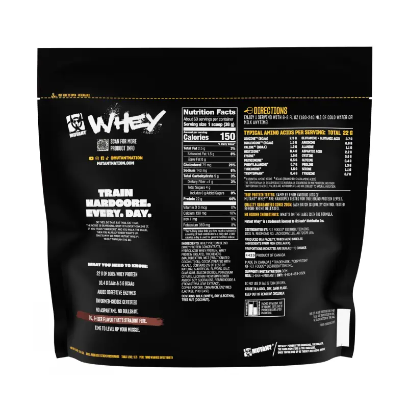 First, add 6–8 fl oz (180–240 mL) of cold water to your shaker cup, then add 1 serving of MUTANT WHEY, shake vigorously for 10–15 seconds, then slam it back and enjoy! TIP: To make it sweeter and thicker, use less liquid; to decrease sweetness and thickness, use more liquid.