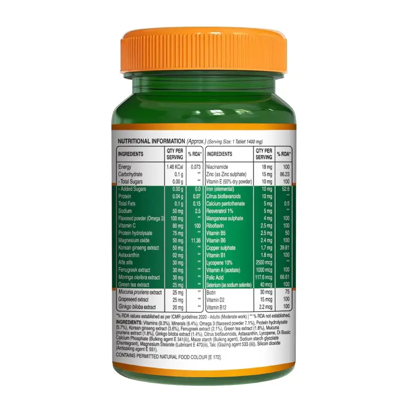 With ingredients like Ginseng, Fenugreek, and Green Tea, this multivitamin helps improve physical energy levels, endurance, and stamina—keeping you active and focused throughout the day.