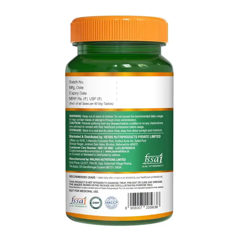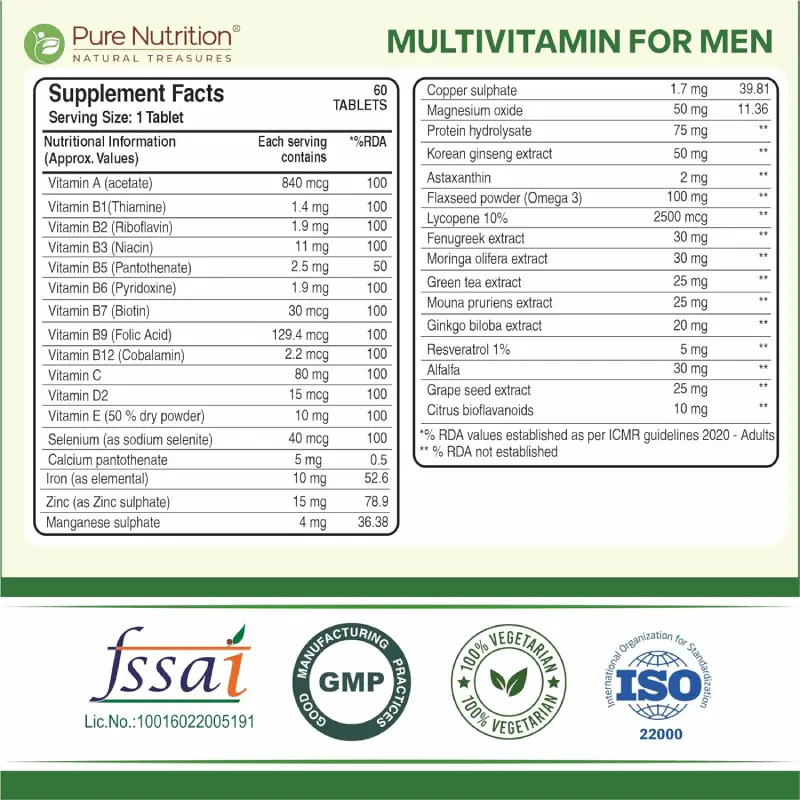 Pure Nutrition Multivitamin for Men is a carefully formulated daily supplement designed to support overall men’s wellness. Enriched with over 32 essential vitamins, minerals, amino acids, and herbal extracts, it helps fulfill daily nutritional requirements and supports energy production, endurance, and bone strength. The advanced blend includes antioxidants and omega-3 fatty acids to promote vitality and long-term health. Ideal for active and busy lifestyles, this multivitamin supports efficient nutrient delivery to muscles, helping improve stamina and performance. Made with high-quality, vegetarian-friendly ingredients, it offers a complete and convenient solution for maintaining daily health and wellness.