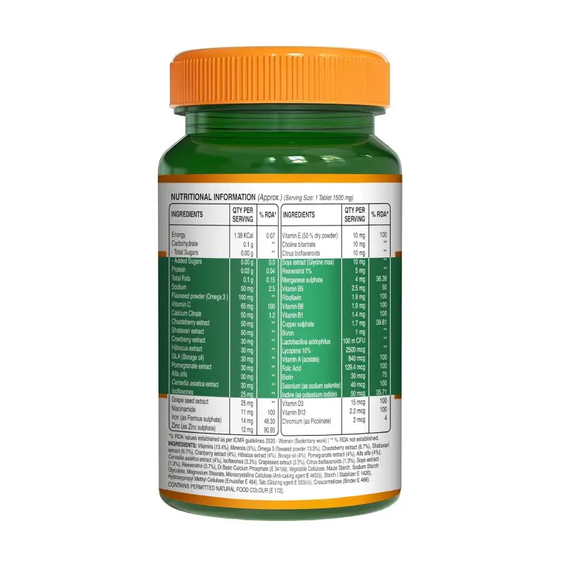 Vitamins (13.4%), Minerals (5) 2020 Women (Sedentario), Chastebery extrat (87) Se 8. Cartery extat (14%), alis (5) Omega 3 (flaxseed powder 13.3%), Chasteberne not established at extra (14) Isola Hibiscus